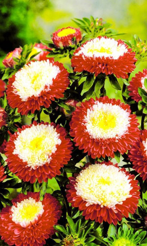 Прекрасная двухцветная астра с помпонными соцветиями Ø7-9 см. Кусты компактные, колонновидные, прочные, высотой 50-60 см, за период вегетации формируют 25-30 соцветий на длинных цветоносах. Цветение раннее и продолжительное, с июля до глубокой осени. Астры холодостойкие, светолюбивые (но выносят полутень), не любят сырых, переувлажненных почв. Широко используются для оформления клумб, бордюров и цветников. Отлично подходят для срезки, цветы стоят в воде до двух недель...