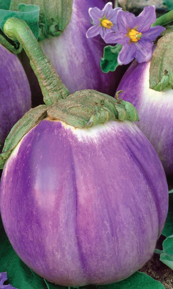 Среднеспелый сорт для открытого грунта и плёночных укрытий. Растение полураскидистое, высотой 63-75 см. Плоды овально-грушевидной формы, полосатые, с чередованием белых и ярко-выраженных розово-фиолетово-сиреневых полос, массой 250-400 г. Мякоть белоснежная, без...