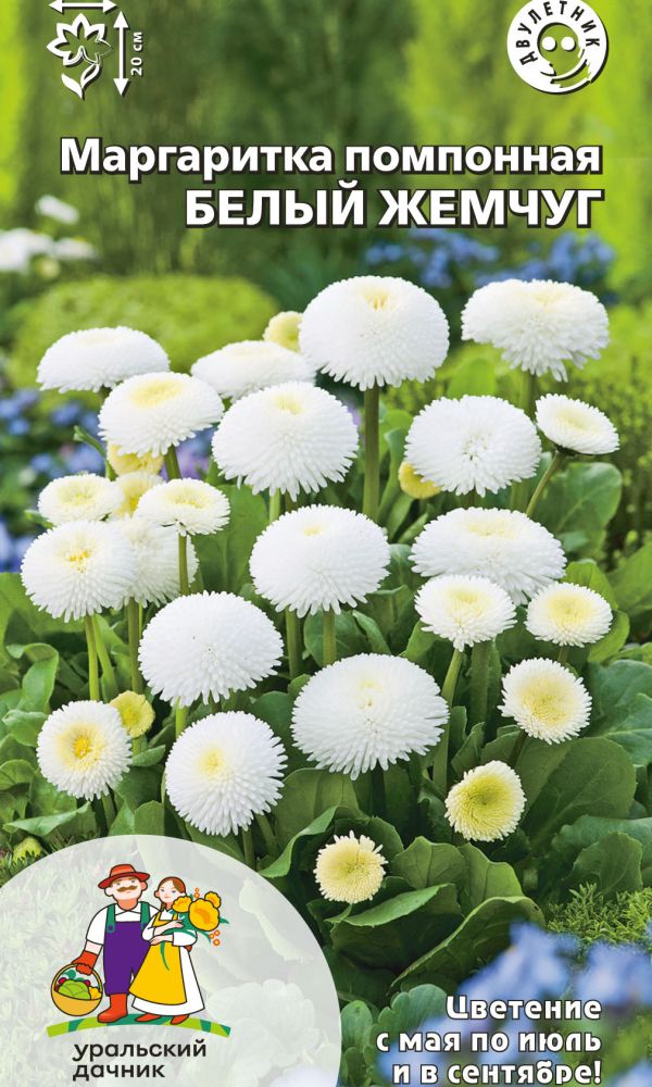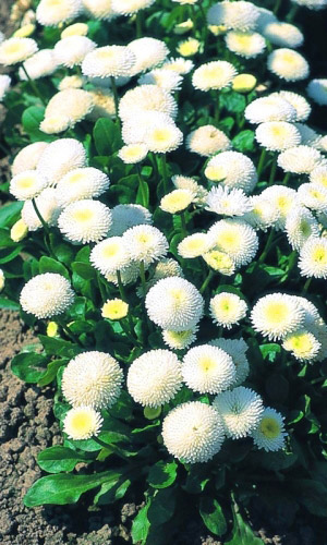 Прекрасные жемчужины вашего сада! Неприхотливое, очень зимостойкое растение. Махровые помпонные соцветия, 4-5 см в диаметре, белоснежной окраски. Маргаритка прекрасно подходит для выращивания на клумбах, рабатках и в бордюрах, а также в горшках и балконных...