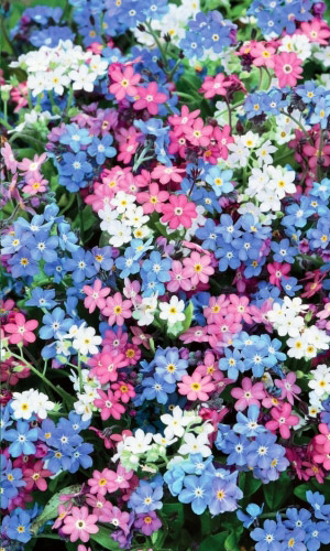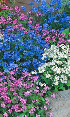 Красивая смесь незабудок. Кроме привычной голубой окраски, включает растения с белыми и розовыми цветками. Образует компактные кустики высотой 25-30 см, обильно цветущие около 50 дней весной и ранним летом. Мелкие цветочки диаметром 1,5 см собраны в рыхлые соцветия-завитки...