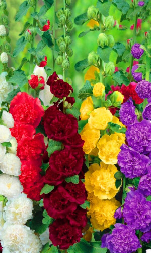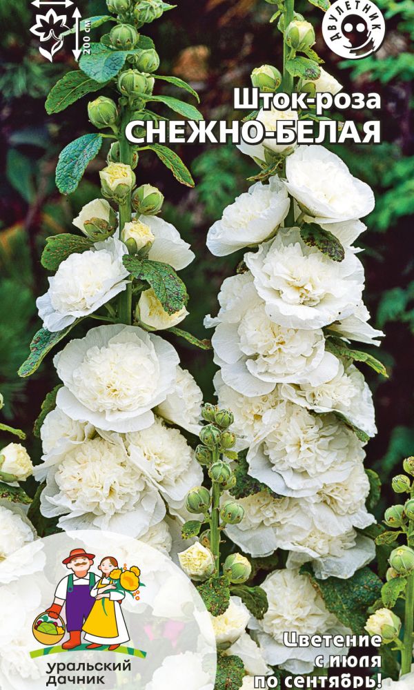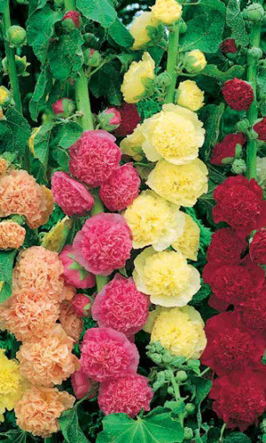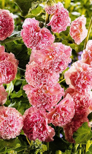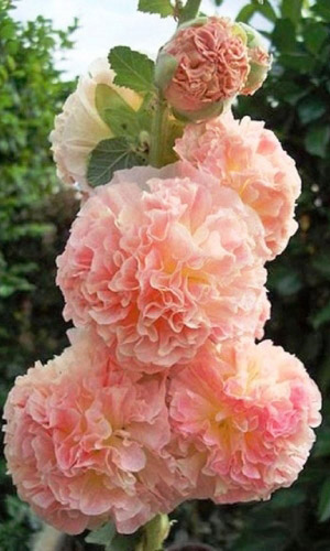 Популярный махровый сорт до 200 см высотой. Цветки крупные, полумахровые и махровые, лососево-розовые. Соцветия компактные. Цветёт на второй год с июля по сентябрь. Используется для небольших групп на газоне, миксбордеров, декорирования стен, заборов и на срезку. Срезанные...