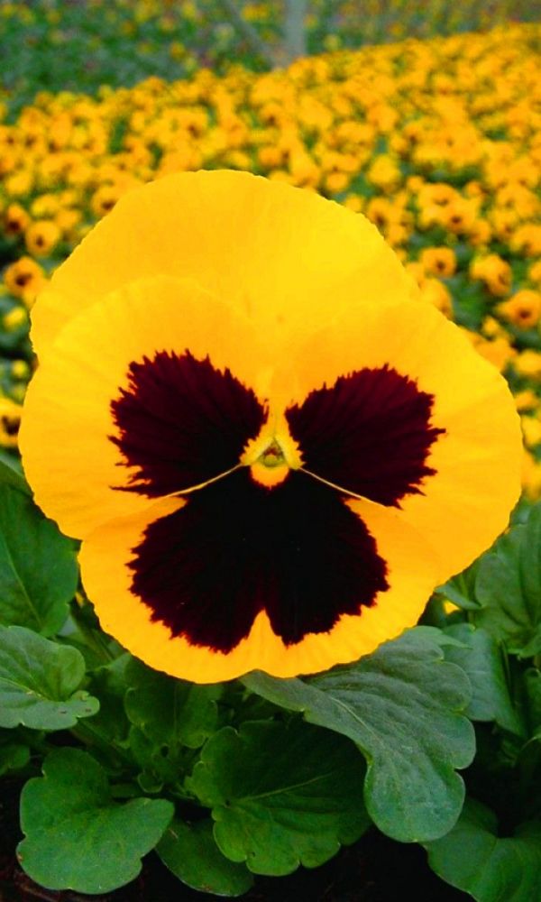 Растение с быстрым ростом, красиво и обильно облиственное, с исполинскими цветками, сидящими на короткой и твердой цветоножке, высотой 15 см. Зимостойкое. Цветы крупные трехцветные. Верхние лепестки красно-бардовые, нижние желтые с черными пятнами у основания лепестков...