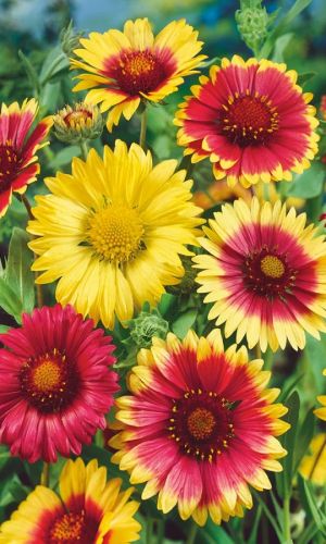 Цветок до 12 смМноголетняя травянистая смесь с роскошными цветками высотой до 60 см. Стебли прямые, в нижней части изгибающиеся, нуждаются в подвязке. Ярко окрашенные соцветия - корзинки диаметром до 12 см. Язычковые цветки пёстрые, преимущественно жёлтых, оранжевых и медно-красных тонов, трубчатые жёлто-пурпурные. Используют на клумбах, бордюрах и альпийских горках.