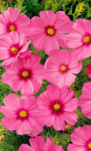 ОднолетнееТравянистое, сильноветвящееся растение с красивой, тёмно-зелёной, ажурной листвой и большим количеством соцветий - корзинок на концах побегов. Лепестки двухцветные, ярко-розовые, к центру переходят в малиновые. Применяют для посадки на заднем плане цветников, декорирования оград и для срезки. С помощью космеи, можно легко и быстро заполнить большие пространства ярким, цветущим ковром.