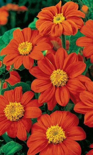 ОднолетнееРоскошные высокие кусты высотой 100 см. Родина титонии – Мексика, её называют еще мексиканским подсолнухом. Стебли красноватые, слабо опушенные. Растение при всей своей мощности не требует подвязки. Соцветия крупные корзинки диаметром 5-8 см, красной окраски, с жёлтой серединой, напоминают немахровые георгины. Цветёт с конца июля до заморозков. Используют в групповых посадках в миксбордерах.