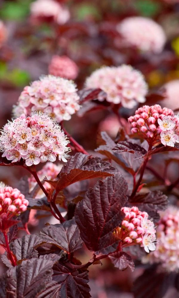 Пузыреплодник калинолистный: сорт Андре представляет собой густой и компактный кустарник с шаровидной кроной, достигающий высоты до 2-2,5 метров. Ветви у него раскидистые и поникающие. Листья похожи на калиновые, но имеют пурпурно-красный оттенок, который осенью сменяется бронзовым. Особенностью листьев является их гофрированная поверхность, придающая кустарнику декоративный вид.