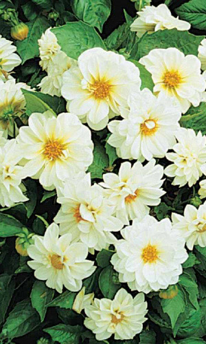 Жизнерадостные низкорослые георгины! Растения компактные высотой около 45 см. Соцветия белые диаметром 8-9 см. Цветет с июля по октябрь. Используют в цветниках большими группами на клумбах. Прекрасный материал для срезки.Агротехника. Любит обильный полив и подкормки...