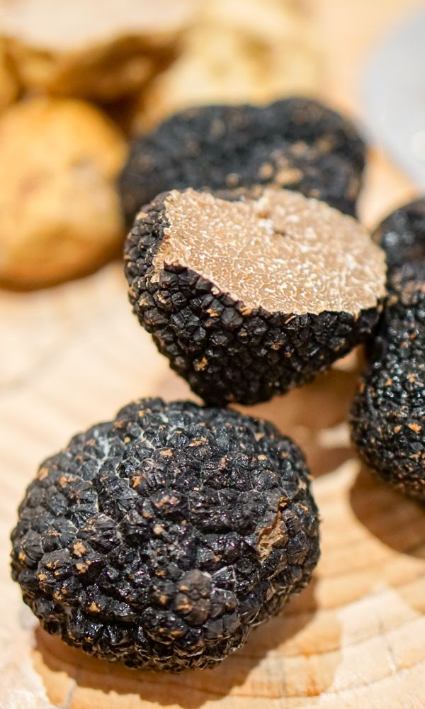 Очень дорогой и загадочный деликатес мировой кулинарии. Обычно имеет неправильную или веретенообразную форму, достигает от 3 до 9 см в диаметре. Поверхность бугорчатая, с большими бородавками пирамидальной формы, тёмная (красновато-коричневая), при созревании – чёрная. Мякоть плотная, вначале желтоватая, затем желтовато-коричневая, на срезе хорошо видны белые прожилки, создающие мраморный рисунок. На вкус мякоть сладковатая, с ореховым привкусом, приятным и насыщенным запахом, напоминающим аромат водорослей, лесной подстилки. Считается, что чёрные трюфели способны пробуждать чувственные ассоциации и специфические желания. Аромат настоящих грибов напоминает букет запахов, в которых угадываются грецкий орех, мох, ягоды, опавшая листва на лесной почве.