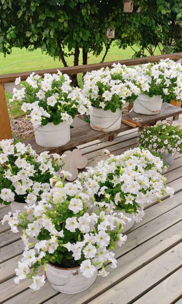 ОднолетнееКуст компактный, высотой 30-45 см, с небольшими аккуратными листочками и поникающими побегами, густо унизанными белыми крупными цветками диаметром 12-13 см. Гибрид устойчив к неблагоприятным погодным условиям. Цветение обильное и продолжительное, с июня по октябрь. Великолепно подходит для оформления подвесных корзин и балконных ящиков.