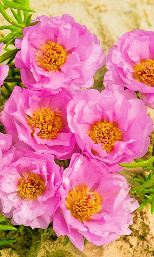 ОднолетнееВеликолепный цветочный ковёр. Многолетнее растение, используемое как однолетнее. Образует кустик высотой 10 см. Розовые, похожие на розочки, махровые цветы, диаметром 3-4 см. Цветёт с июня до заморозков.