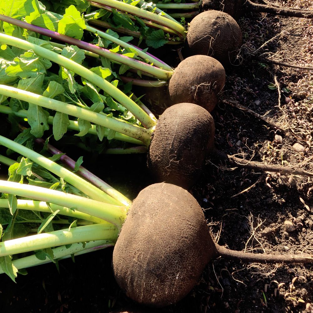 Среднеспелый сорт. Период от всходов до уборки урожая 70-95 дней. Розетка полураскидистая. Корнеплод чёрный, округлый, длиной 8-12 см, диаметром 9-13 см. Поверхность слегка бороздчатая. Мякоть белая, плотная, сочная, остро-сладкого вкуса. Масса до 300 г. В почву погружён полностью, легко выдергивается. Отлично хранится.