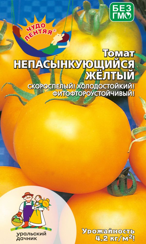 Супернеприхотливый, со стабильной урожайностью. Раннеспелый, высотой 50 см, плоды округлые, гладкие, золотисто-жёлтые, массой 80-100 г, сладкие. Идеален для засолки.На рассаду семена высевают в марте - начале апреля, на глубину 1 см. Пикировка в фазе 1-2 настоящих листьев...