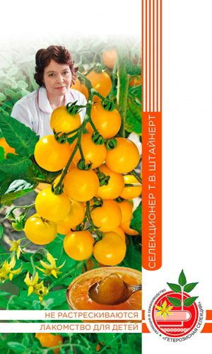 Среднеранний индетерминантный сорт. Предназначен для выращивания в теплицах и парниках с отличной завязываемостью плодов при сложных погодных условиях. Растение кистевого типа, высотой около 2 м. В кисти по 6-7 плодов, весом 80-90 г. Плоды имеют жёлтую с красноватым румянцем...