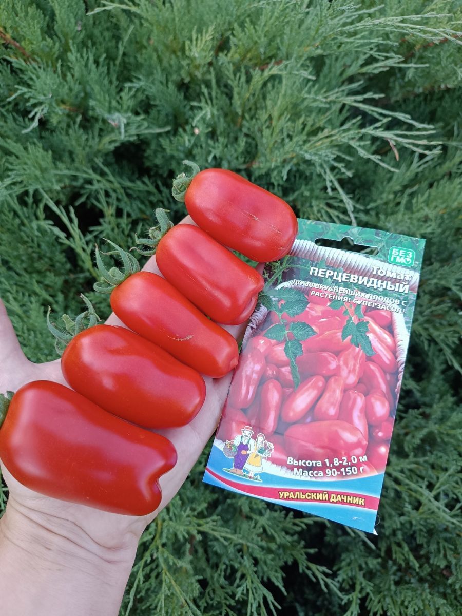 Томат Перцевидный – среднеспелый сорт. Плоды сладкие, мясистые, перцевидной формы, цвет – красный. Плоды содержат мало жидкости и семян. Вкусовые качества томатов отличные, плоды используются для приготовления свежих салатов, засола и консервирования, пригодны для фарширования.