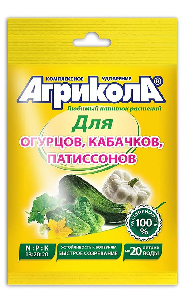 Удобрение для подкормки огурца, кабачка, патиссона, дыни и других тыквенных культур. Опрыскивание удобрением Агрикола-5 с интервалом 10-12 дней, способствует повышению урожайности, предупреждает опадание женских цветков и удлиняет период плодоношения.NPK 13-20-20 + MgO + микроэлементы...