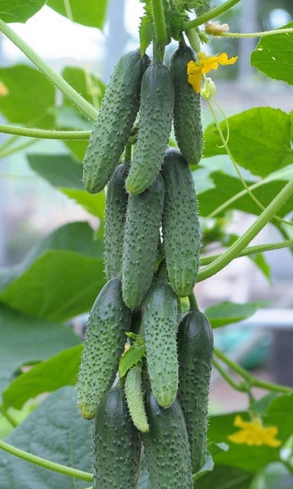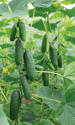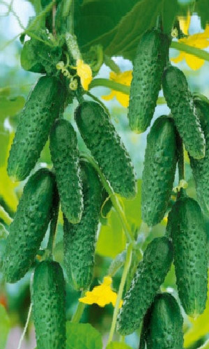 Букетное расположение завязей;Изобилие вкусных корнишонов.Переносит резкие перепады температур. Партенокарпический гибрид для защищённого и открытого грунта. От всходов до плодоношения 38-42 дня. Более 5-ти завязей в узле. Плоды цилиндрической формы, без горечи, длиной 7-9 см, тёмно-зелёной окраски с короткими полосами, крупнобугорчатые, белошипые. Масса 90-120 г. Устойчив к кладоспориозу, настоящей мучнистой росе, корневым гнилям, вирусу огуречной мозаики. Рекомендуется для маринования...